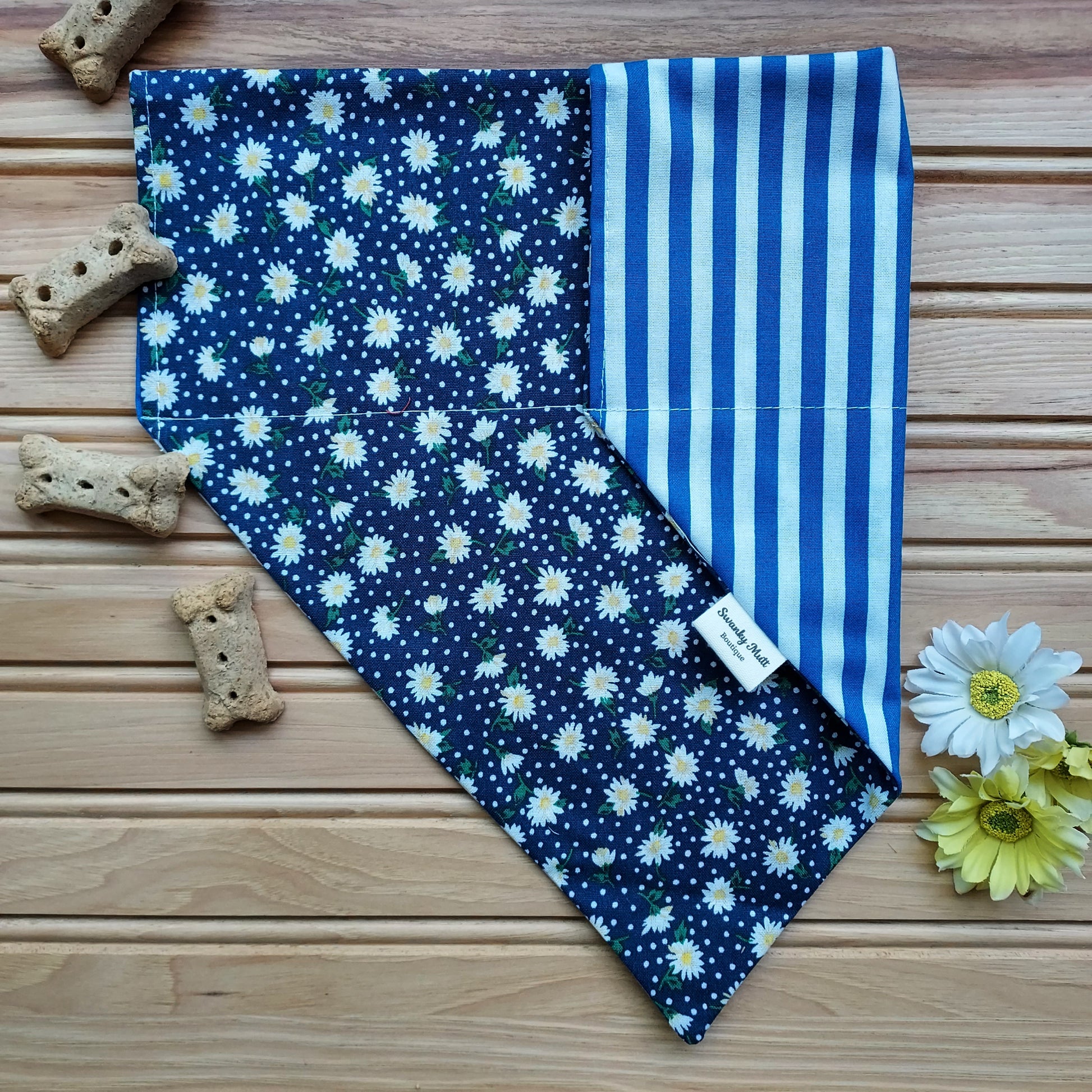 Dog Bandana - Reversible Slide-Over The Collar - White Daisies w/ Blue and White Stripes